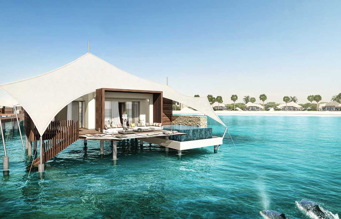 وعلى جانبي المنتجع، تمتد أجنحة غرف الضيوف، المطلة على واجهة بحريّة طبيعية متألقة تحيط بها الشرفات والجلسات الخارجية. ولكي يكتمل المنظر الخلاب، فقد صممنا برك سباحة للاستجمام والتمتع بجمال الطبيعة على ذلك الساحل. بهذا يمكن للضيوف الكرام الاستمتاع بأروع تجربة على إطلالة الشاطئ.