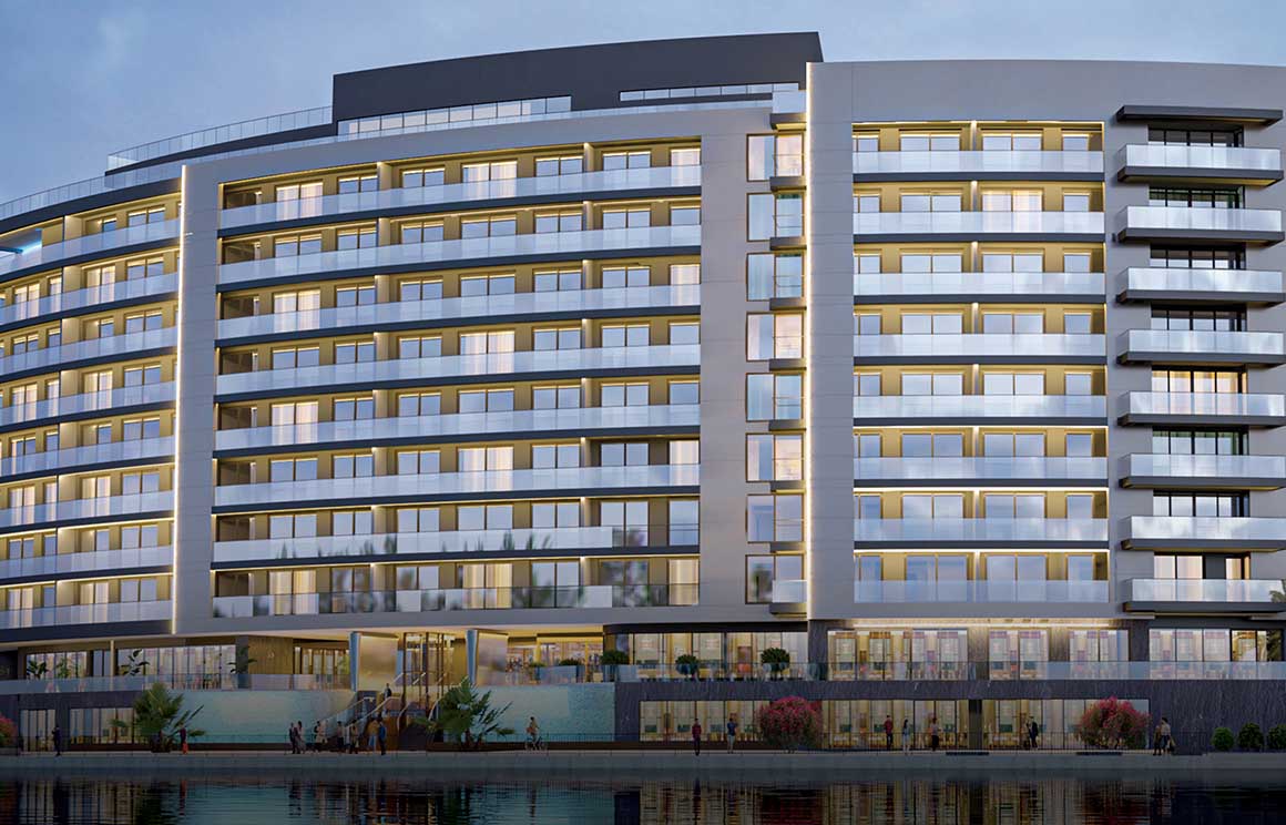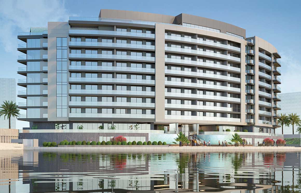 With a prime location, right at the edge of Dilmunia’s grand canal, this impressive nine-level residence is designed in a gentle curve to command attention from outside and to enhance stylish living from within. Situated on a site area of 5,529 sqm, the building comprises two basement levels for parking, lower and upper ground levels, with eight floors of residential apartments and a recreation level.